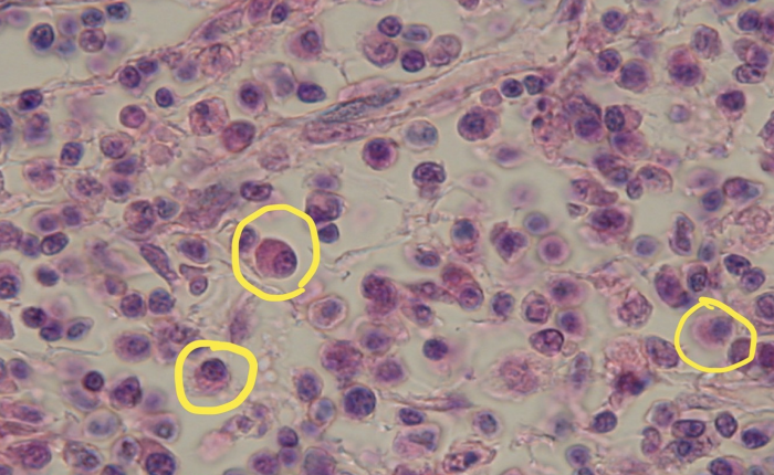 ![]() | - ๋ฆผํ๊ตฌ๋ฅผ ๋ฎ์์ผ๋, ๋ฆผํ๊ตฌ๋ณด๋ค ํผ. - ์ฐจ ๋ฐํด ๋ชจ์์ ํต (heterochromatin์ด ํต ์ฃผ๋ณ๋ถ์ ๋ฉ์ด๋ฆฌ์ฒ๋ผ ๋ชจ์ฌ ์์), ํ ์ชฝ์ผ๋ก ์ ๋ ค ์์. - ์ธํฌ์ง์ RER์ด ๋์ basophilic - Russel body ๊ด์ฐฐ : ํญ์ฒด ์ถ์ ๋ ๊ฒ, inclusion body์ฒ๋ผ ๋ณด์. - Golgi complex : ํต ๊ทผ์ฒ์์ ์ผ์๋์ง ์์ ์ฑ๋ก ๊ด์ฐฐ๋จ. |